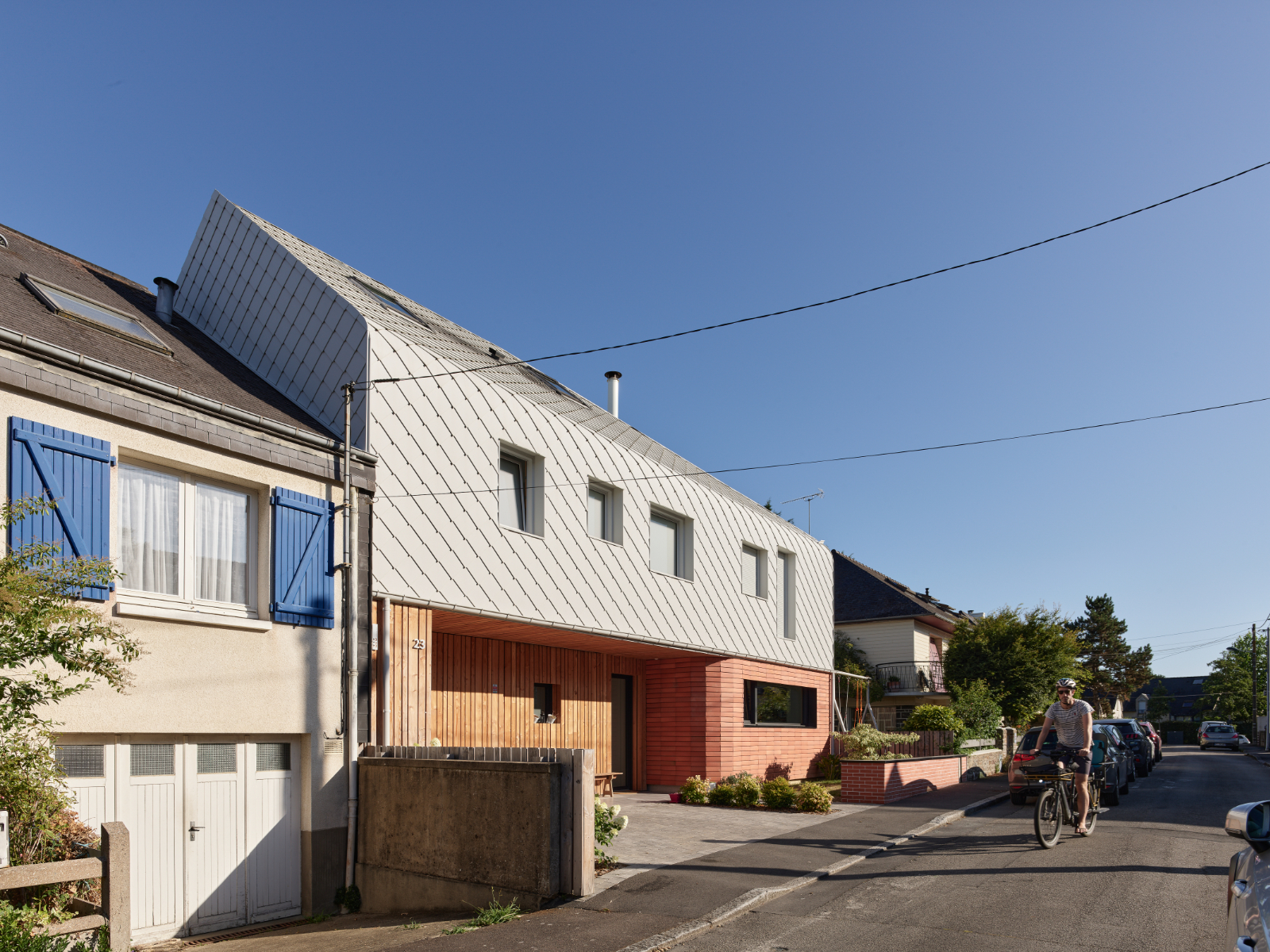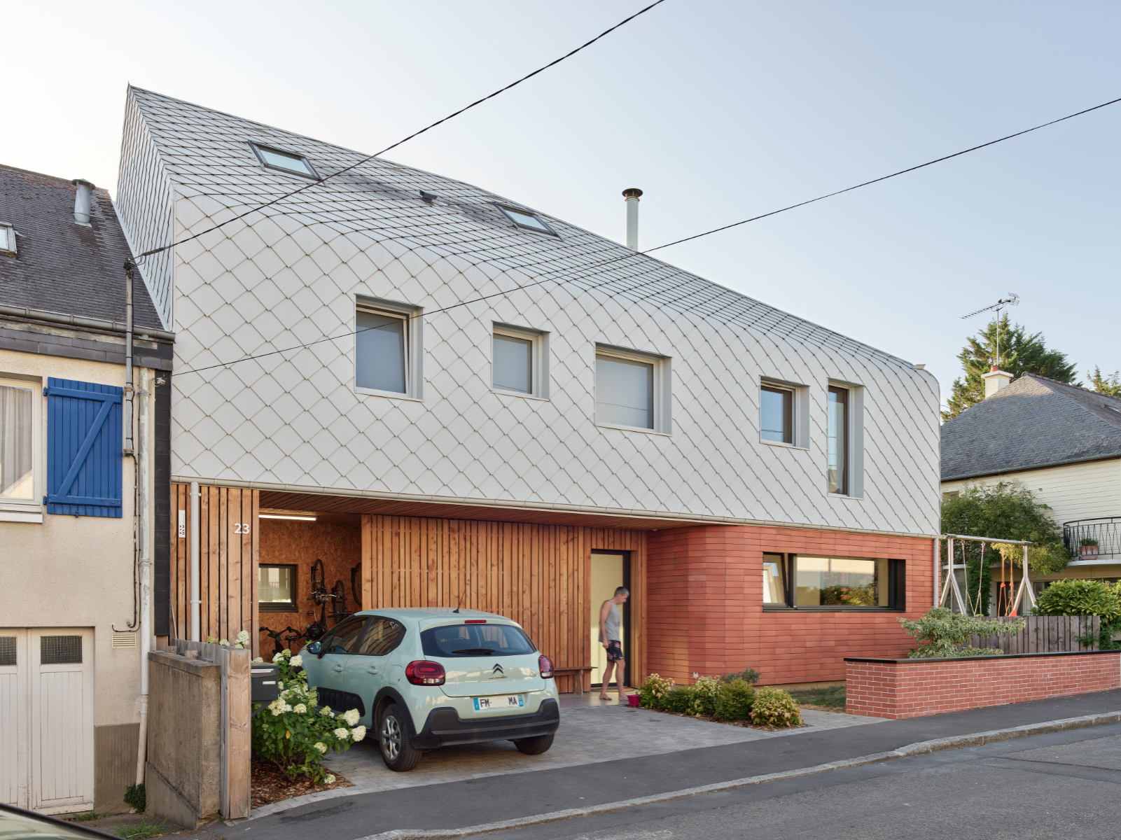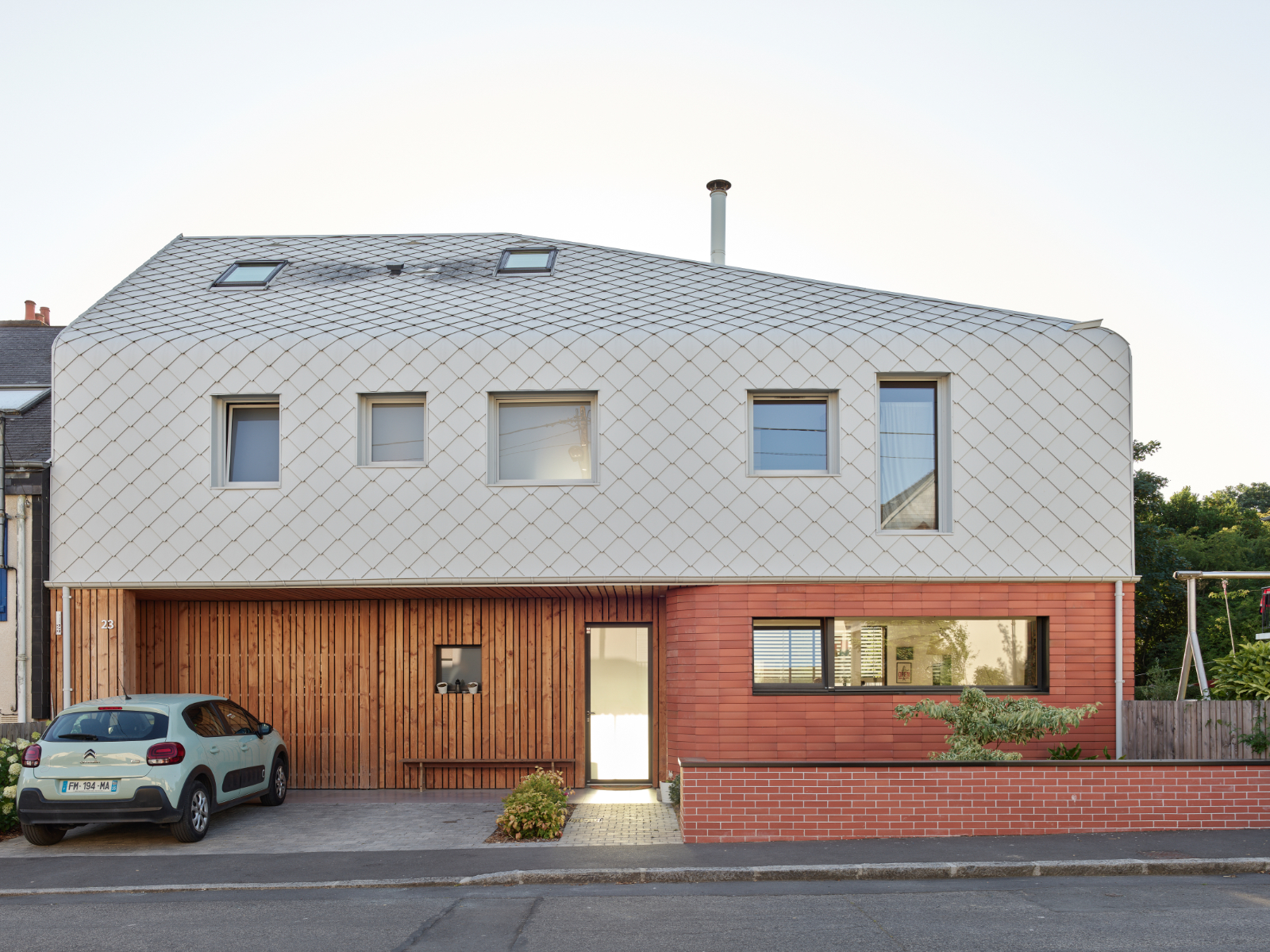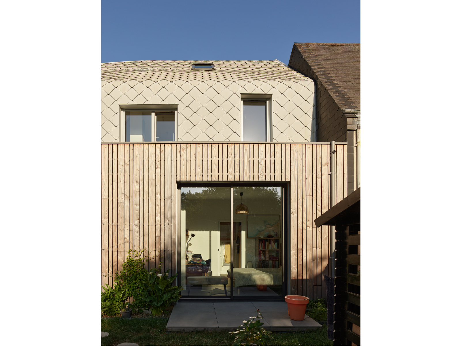 La maison reprend le principe de rez-de-chaussée "socle" remarquable sur plusieurs maisons de la rue, marqué par ses bardages en bois et en terre cuite, qui conduisent à l'entrée. La couverture est volontairement tronquée côté Nord, pour limiter l'ombre portée chez le voisin et ne pas construire un volume inutile. L'étage et la couverture sont comme une carapace d'écailles d'aluminium blanc, qui descend comme une peau et contraste avec les autres matières. L'effet carapace des écailles d'aluminium est accentué par la mise en place des gouttiètres en bas du bardage: la jonction toiture-façades est alors légèrement arrondie, pour guider l'eau jusqu'en pied de mur. La teinte claire, en toiture comme en façades, associée à des occultations extérieures commandées par domotique, permet que les chambres restent très confortables, même en cas de forte chaleur.