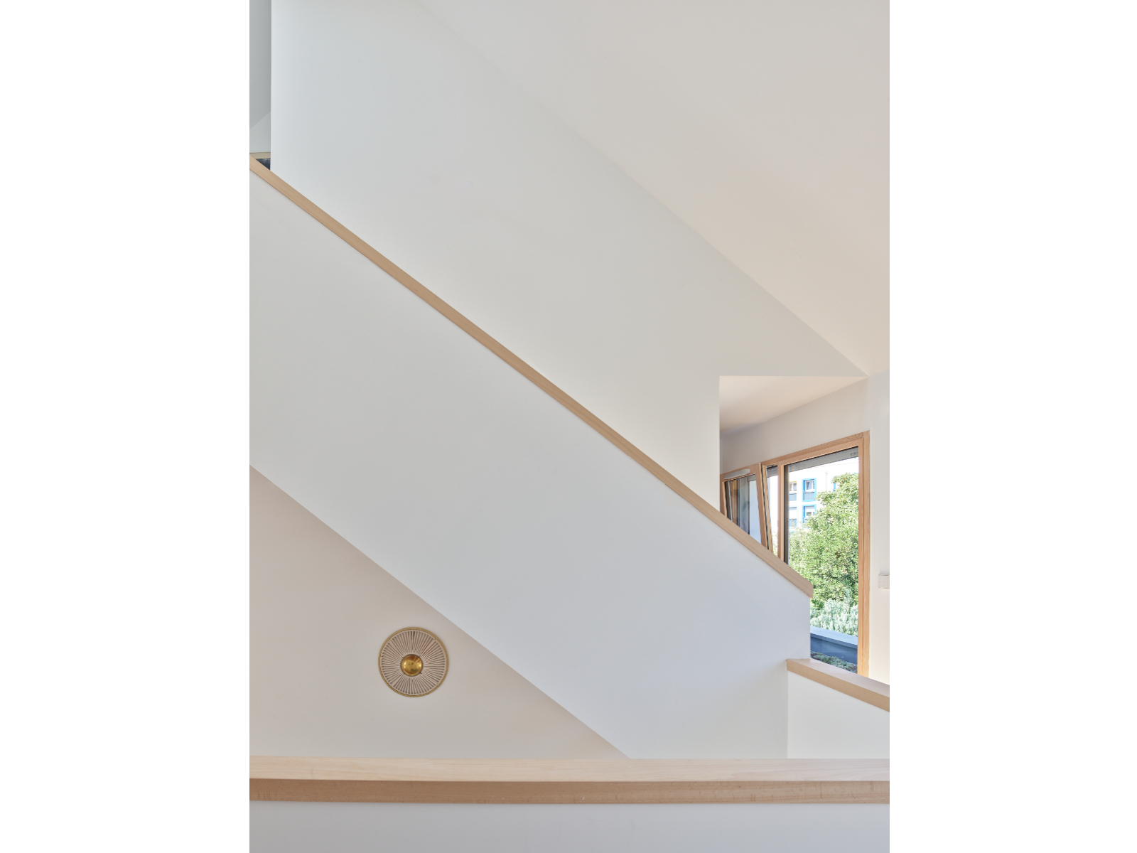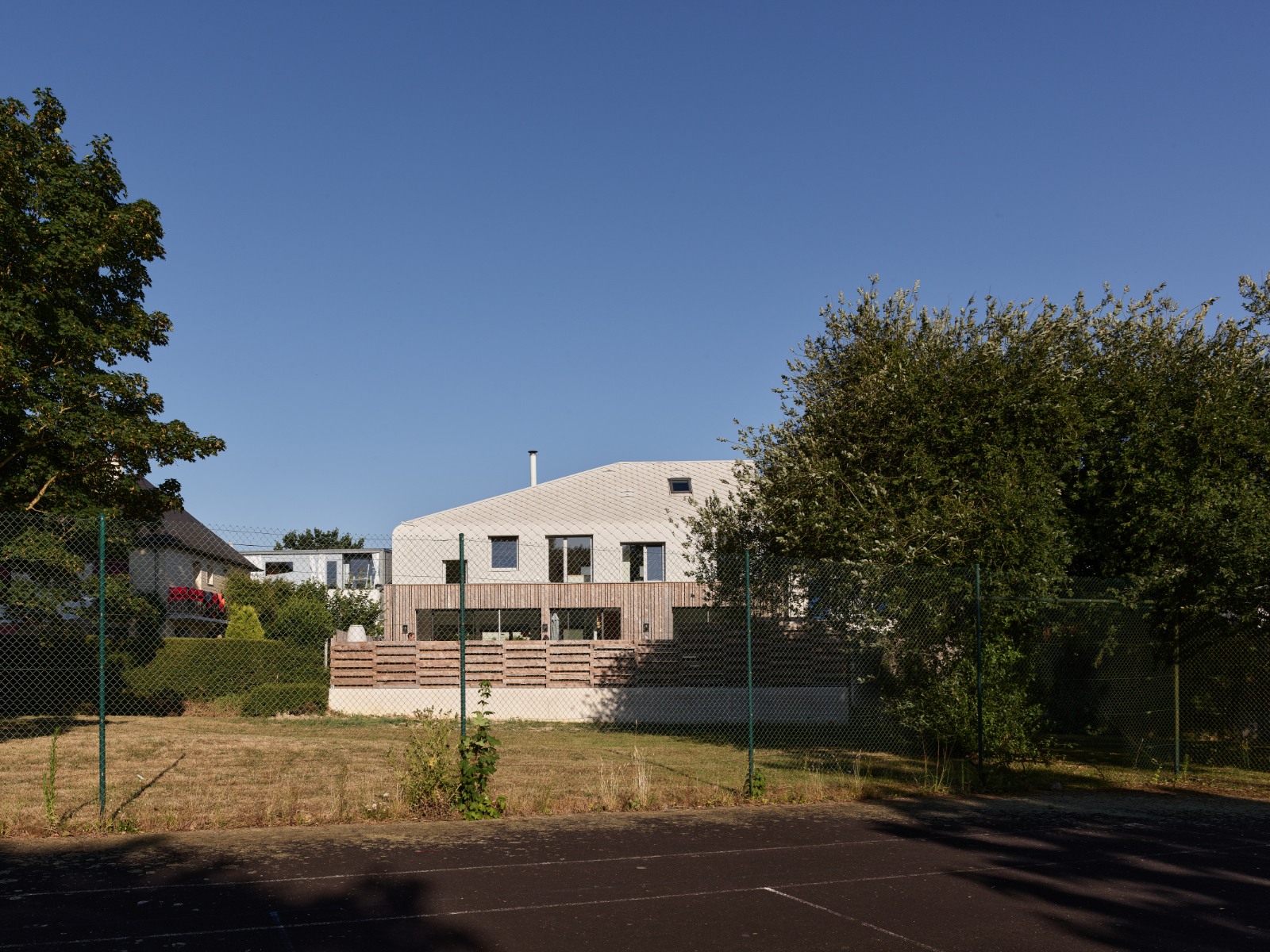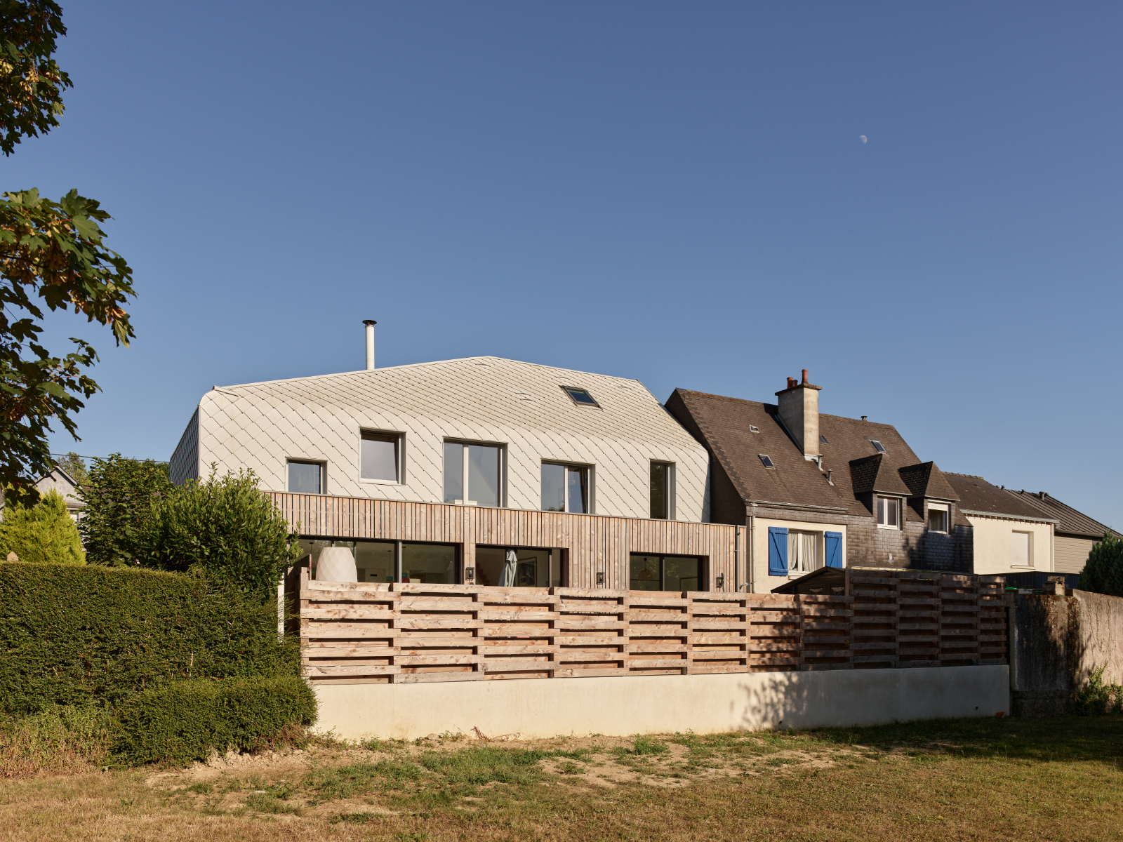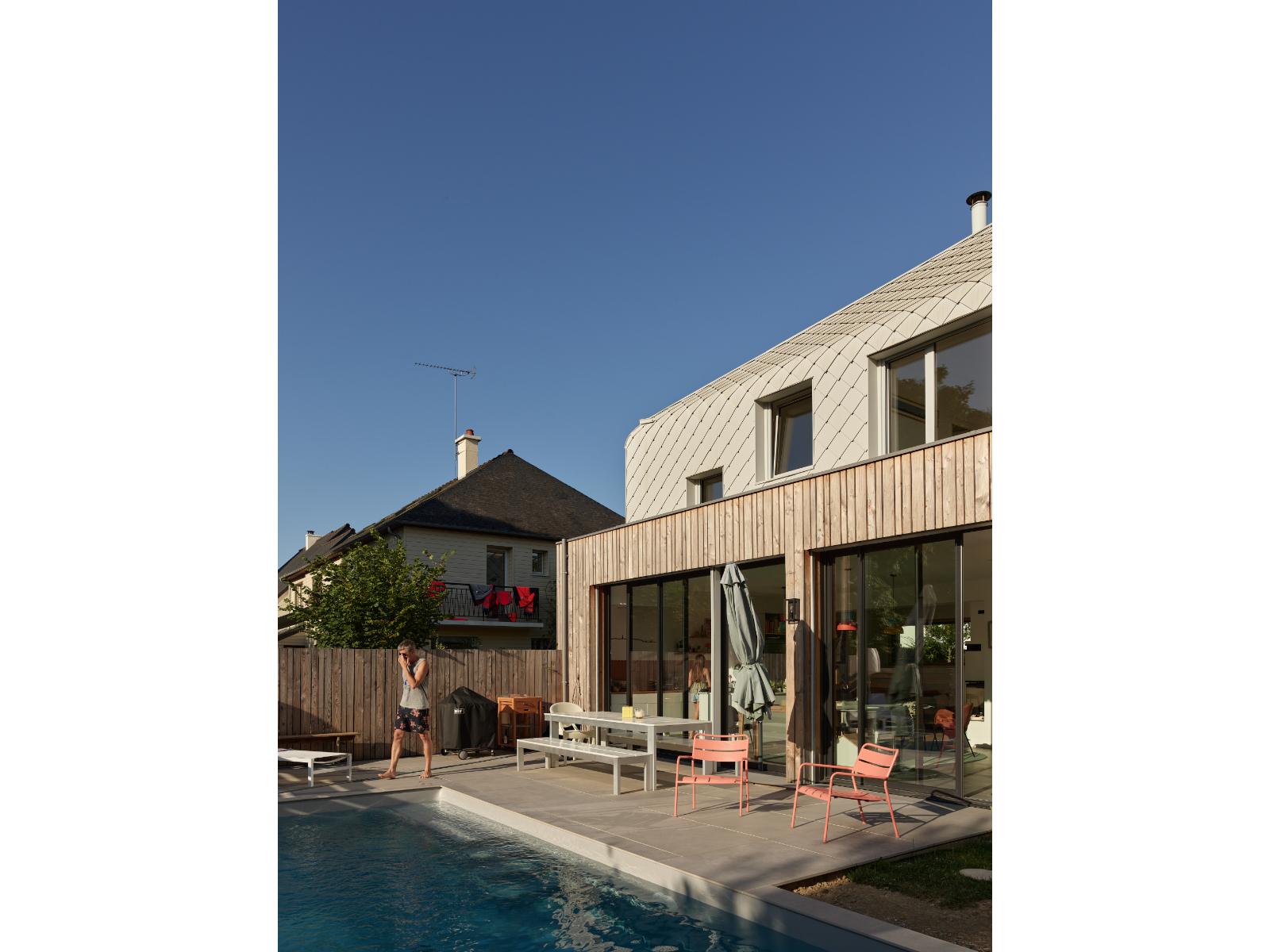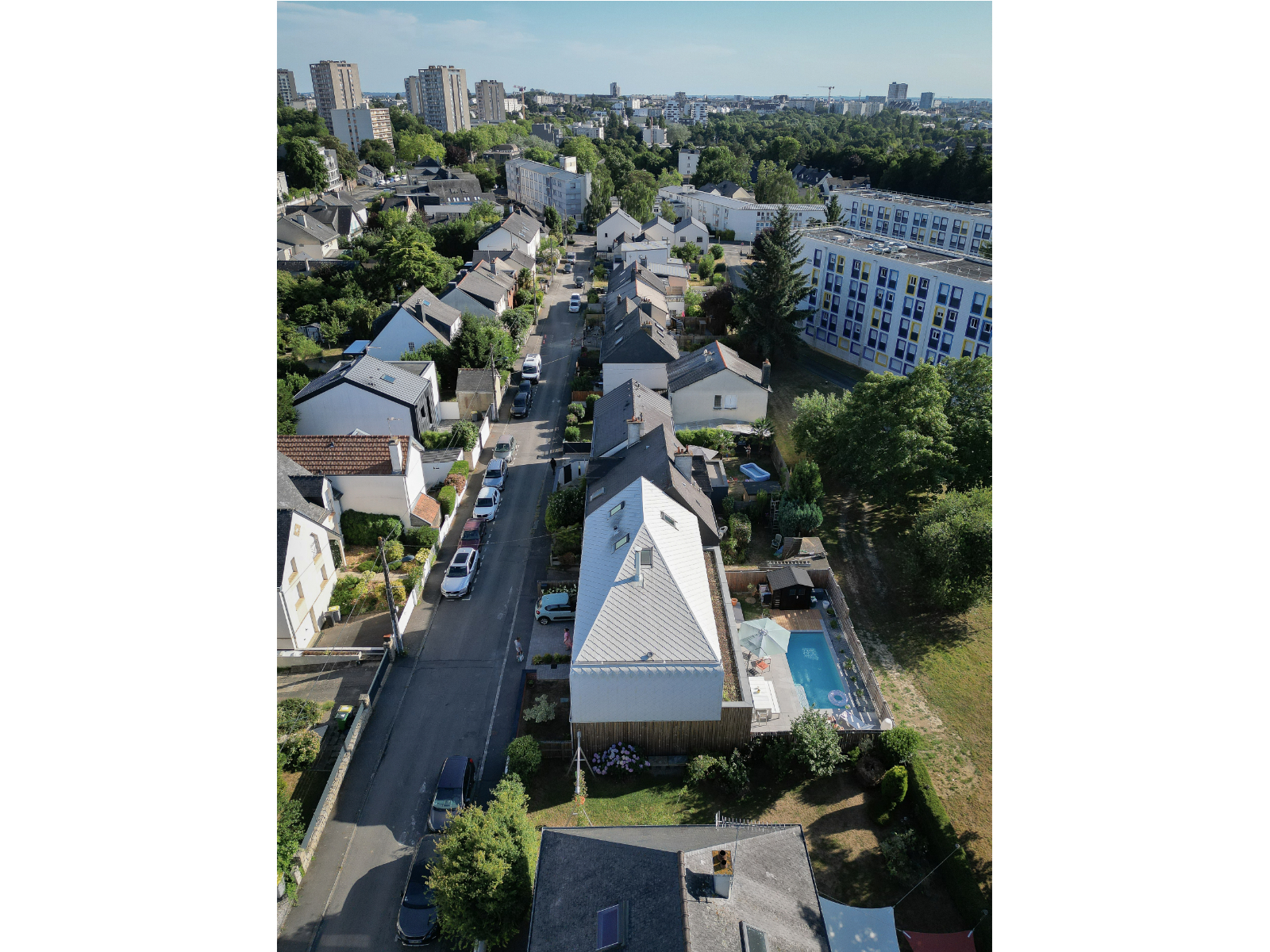 La maison reprend le principe de rez-de-chaussée "socle" remarquable sur plusieurs maisons de la rue, marqué par ses bardages en bois et en terre cuite, qui conduisent à l'entrée. La couverture est volontairement tronquée côté Nord, pour limiter l'ombre portée chez le voisin et ne pas construire un volume inutile. L'étage et la couverture sont comme une carapace d'écailles d'aluminium blanc, qui descend comme une peau et contraste avec les autres matières. L'effet carapace des écailles d'aluminium est accentué par la mise en place des gouttiètres en bas du bardage: la jonction toiture-façades est alors légèrement arrondie, pour guider l'eau jusqu'en pied de mur. La teinte claire, en toiture comme en façades, associée à des occultations extérieures commandées par domotique, permet que les chambres restent très confortables, même en cas de forte chaleur.