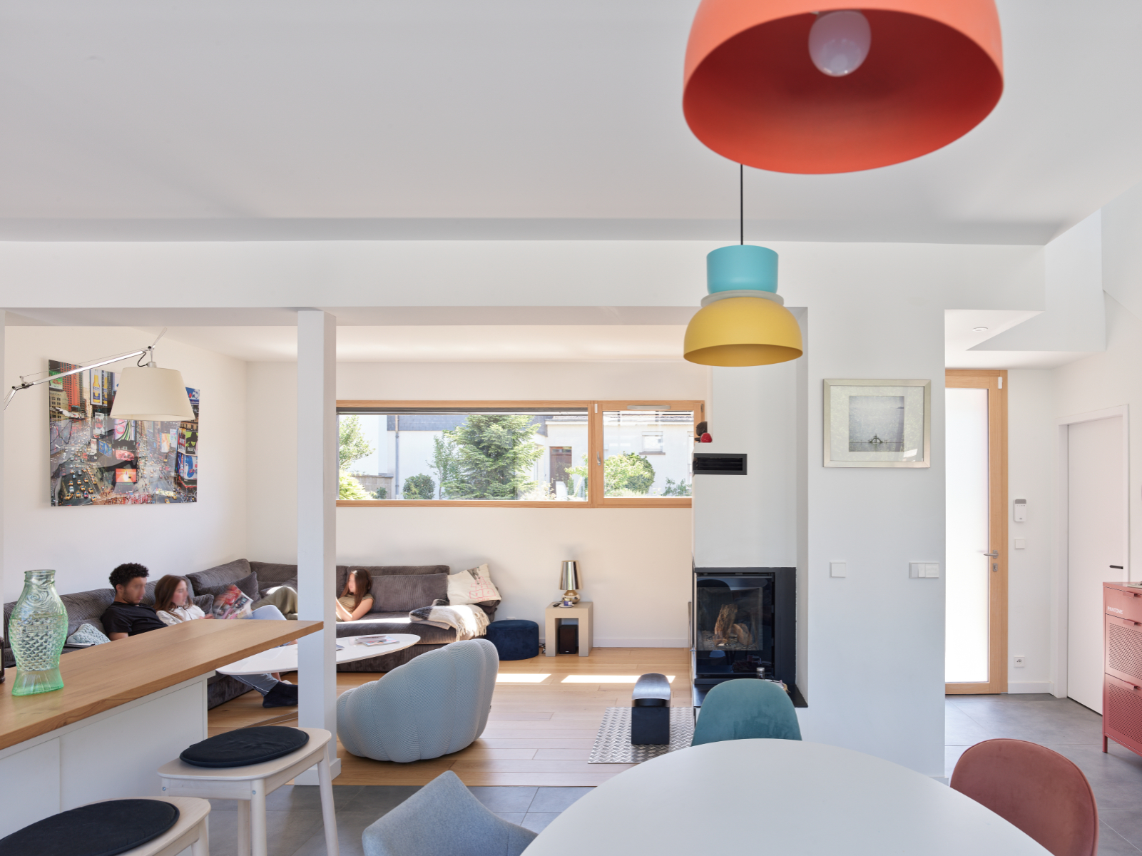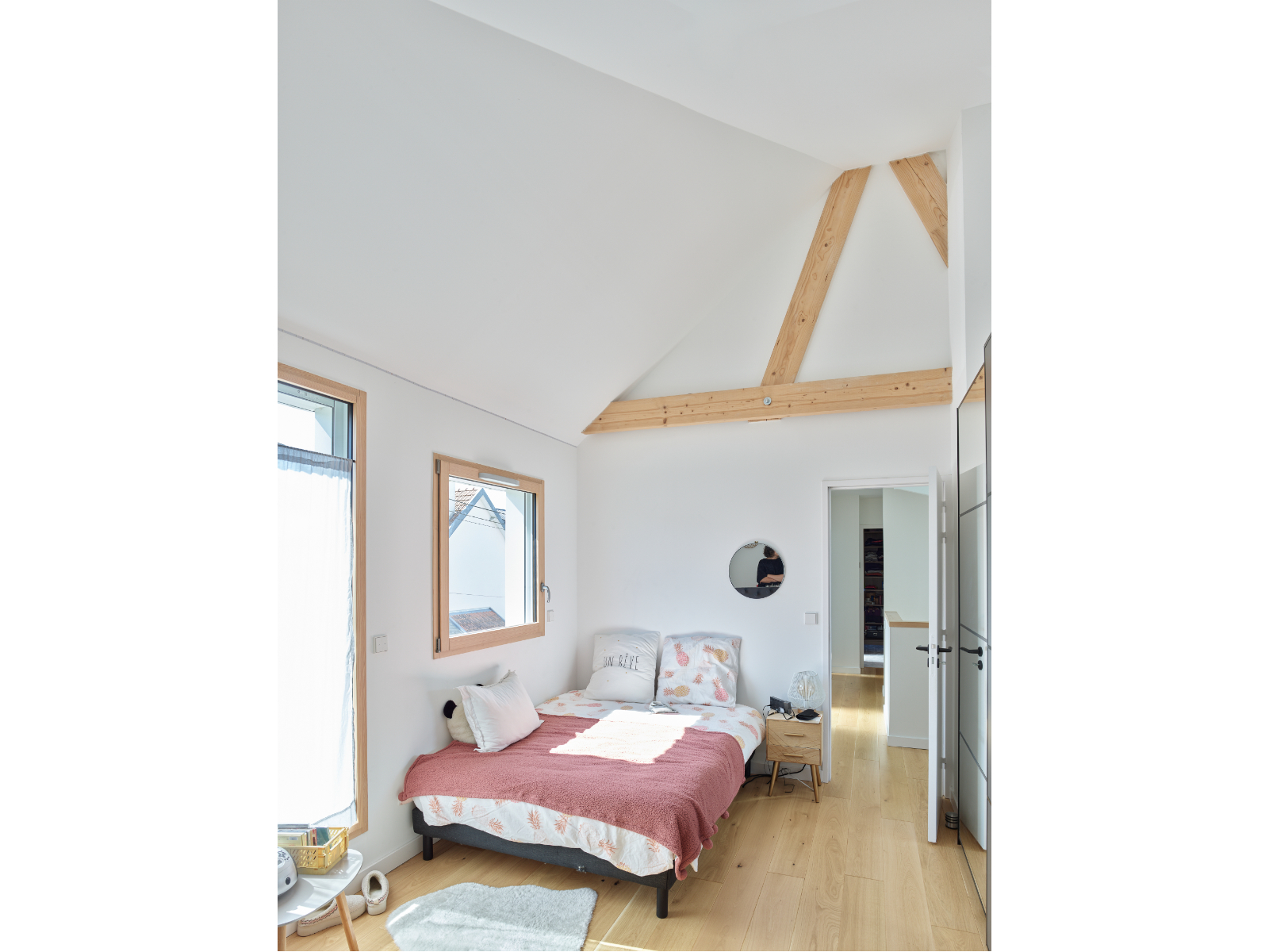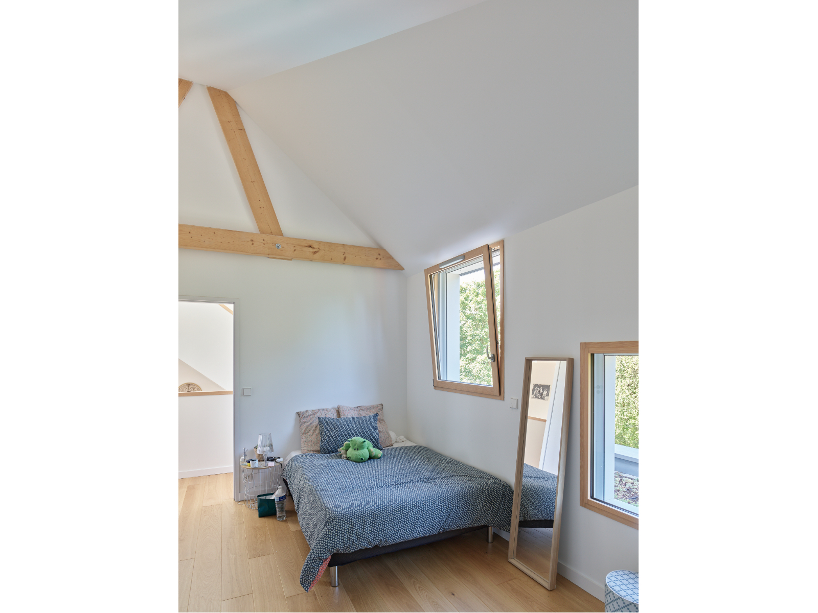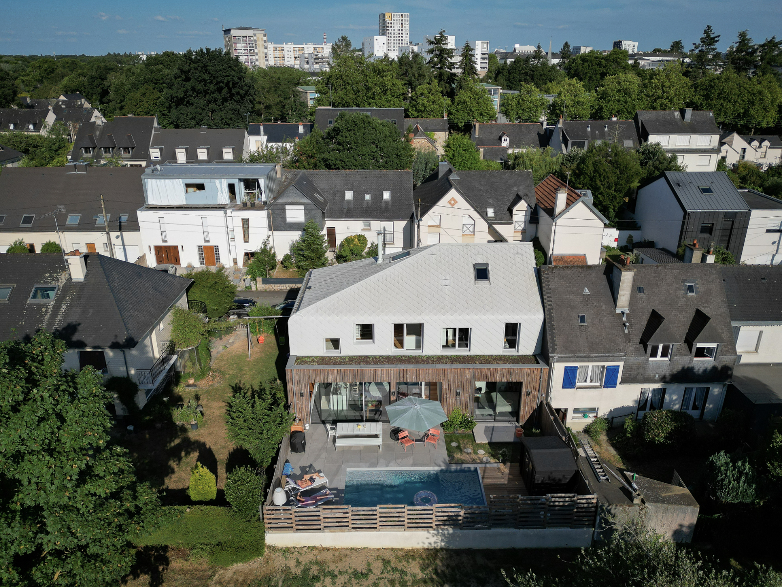 Il y avait sur ce terrain une petite maison ancienne et vétuste en fond de jardin, très étroite, mono-orientée et entièrement tournée vers la rue, donc avec beaucoup de vis à vis. Pour intimiser le jardin et profiter de la vue sur un espace boisé protégé sur le terrain voisin en fond de parcelle, l'ancienne maison est démolie. La maison neuve s'implante dans la continuité des maisons de la rue et sur toute la largeur de la parcelle. Très légèrement plus haute que les maisons voisines, elle offre des volumes intérieurs généreux avec de belles hauteurs sous plafond (2,80m au rez-de-chaussée et jusqu'à 4,30m dans les chambres des enfants), et des espaces traversants très lumineux qui s'ouvrent pleinement et sans aucun vis à vis sur la terrasse, le jardin, la piscine puis l'horizon arboré. La maison abrite une pièce de vie de 53m², 5 chambres, 3 salles d'eau, 1 bureau et 1 sauna. Une belle arrière cuisine, une grande cave et un petit grenier offrent enfin un espace de stockage généreux.