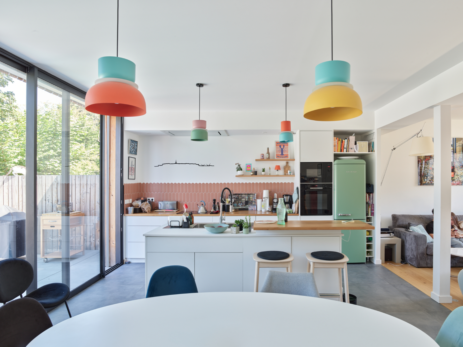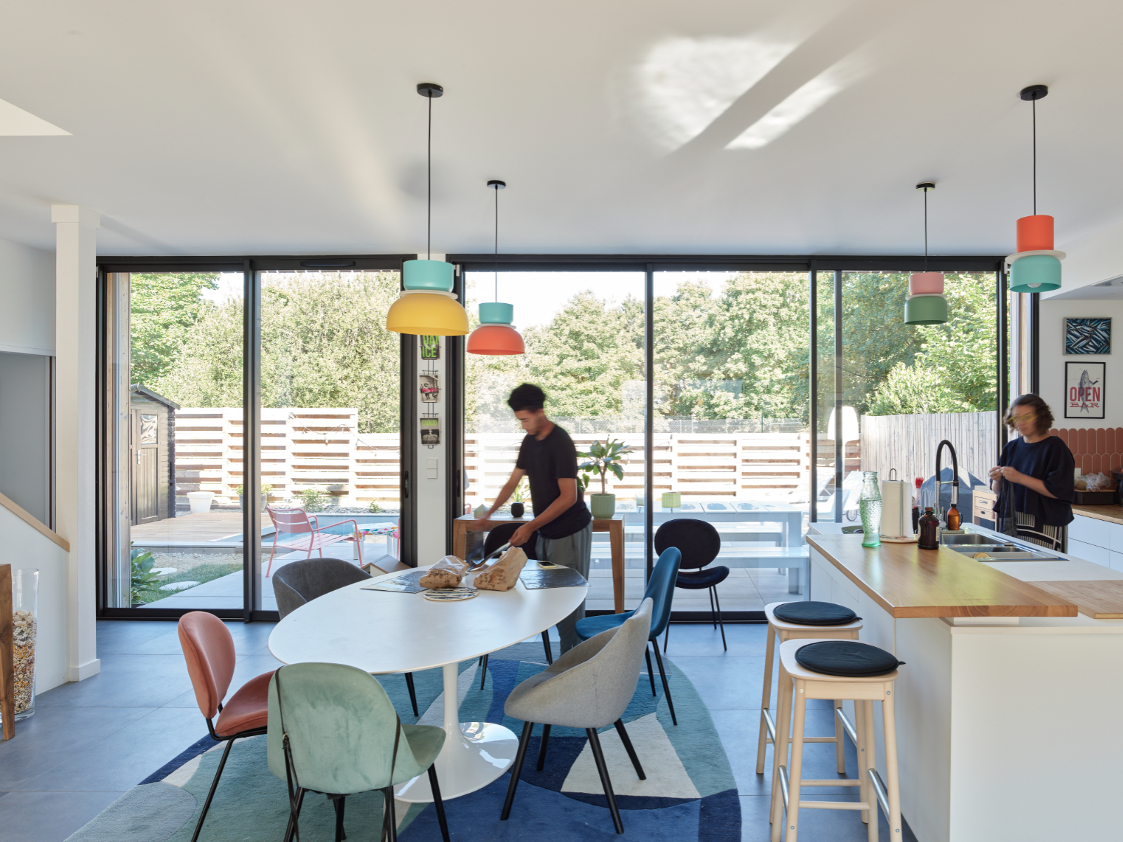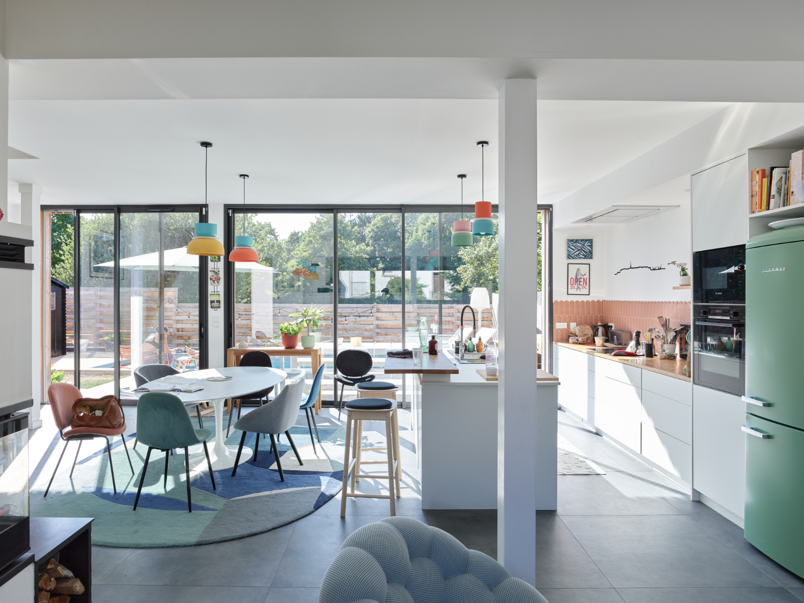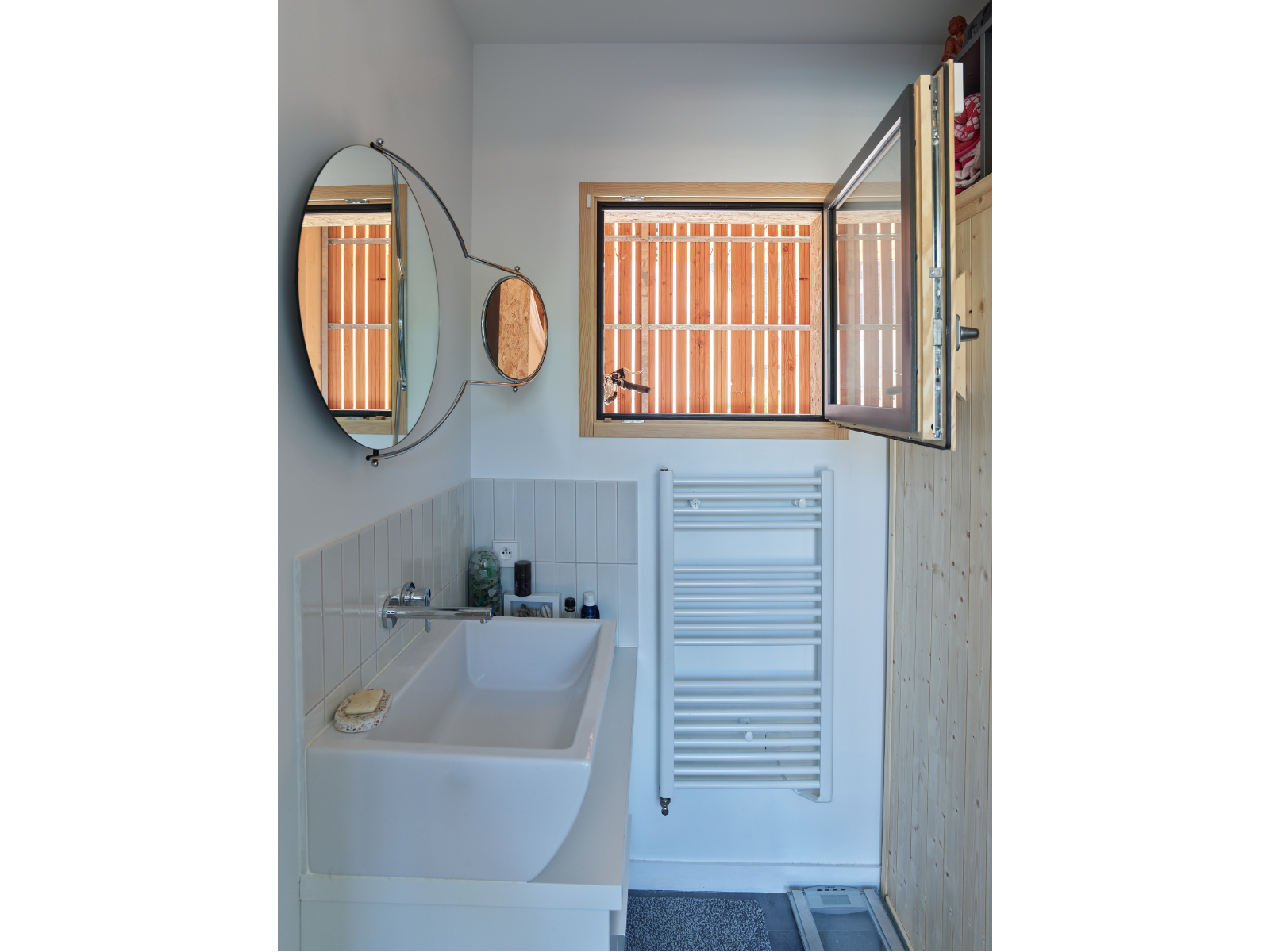 Il y avait sur ce terrain une petite maison ancienne et vétuste en fond de jardin, très étroite, mono-orientée et entièrement tournée vers la rue, donc avec beaucoup de vis à vis. Pour intimiser le jardin et profiter de la vue sur un espace boisé protégé sur le terrain voisin en fond de parcelle, l'ancienne maison est démolie. La maison neuve s'implante dans la continuité des maisons de la rue et sur toute la largeur de la parcelle. Très légèrement plus haute que les maisons voisines, elle offre des volumes intérieurs généreux avec de belles hauteurs sous plafond (2,80m au rez-de-chaussée et jusqu'à 4,30m dans les chambres des enfants), et des espaces traversants très lumineux qui s'ouvrent pleinement et sans aucun vis à vis sur la terrasse, le jardin, la piscine puis l'horizon arboré. La maison abrite une pièce de vie de 53m², 5 chambres, 3 salles d'eau, 1 bureau et 1 sauna. Une belle arrière cuisine, une grande cave et un petit grenier offrent enfin un espace de stockage généreux.