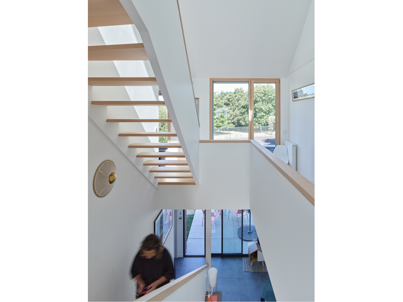 Le léger retait de la façade d'entrée par rapport à l'alignement permet d'abriter l'entrée, de stationner 2 voitures à l'avant de la maison et d'accéder facilement au grand local vélos, dissimulé derrière le bardage en bois.