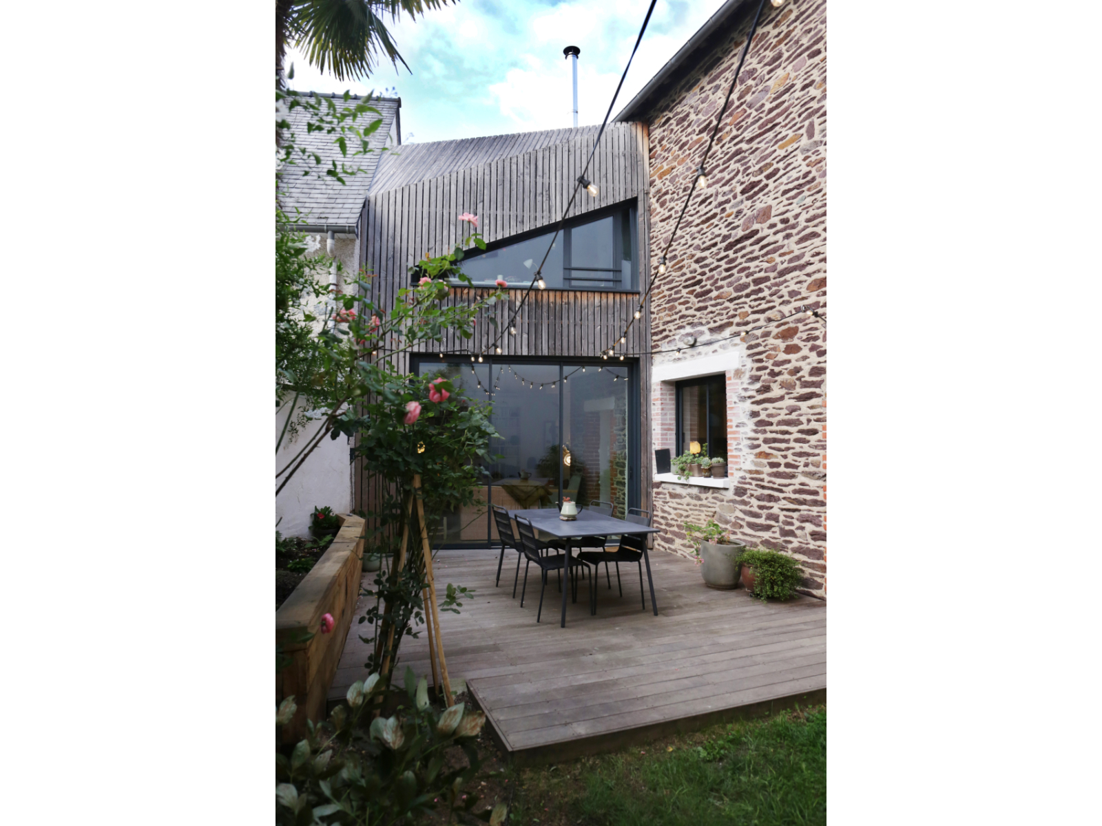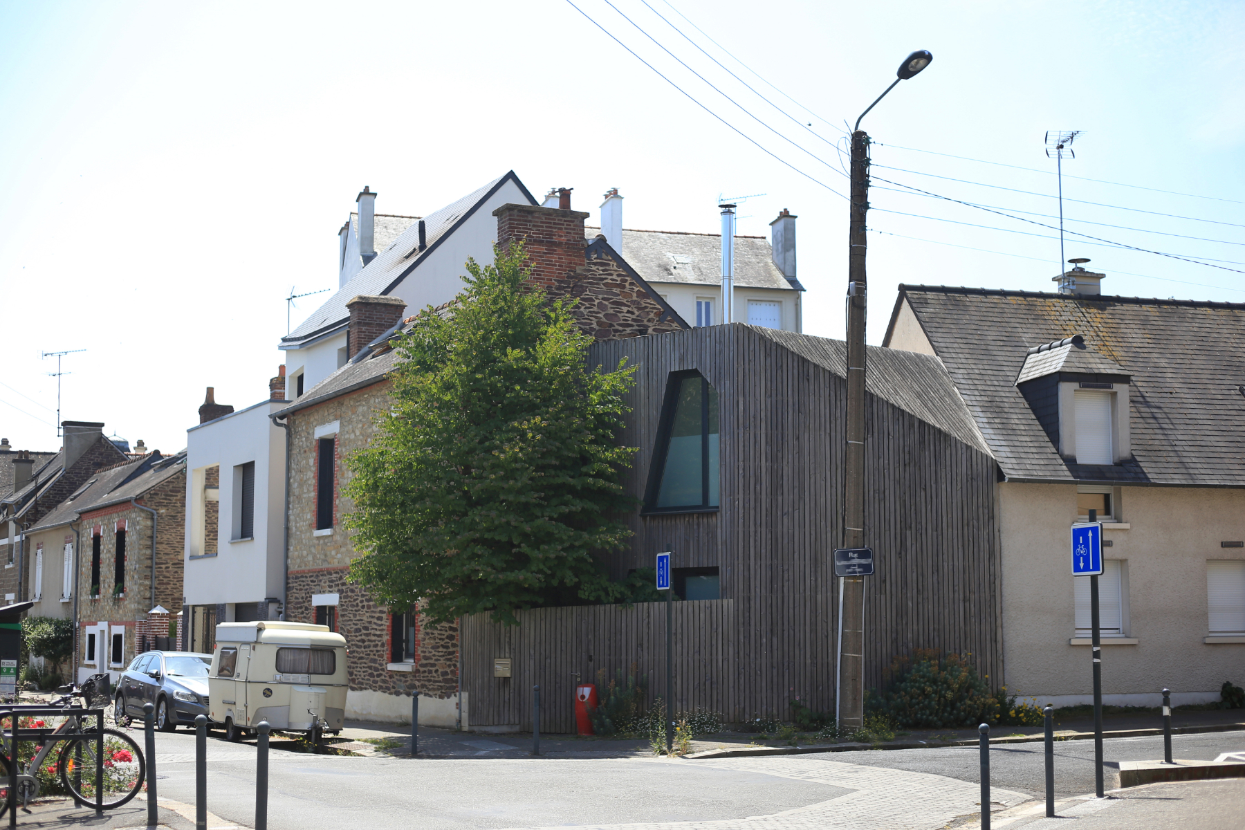 L'extension prend place dans la dent creuse existant entre la maison et la maison voisine, côté Nord du terrain. L'entrée sur le terrain se fait via un patio, le règlement d'urbanisme de l'époque interdisant de construire sur l'angle de rue: cette contrainte permet de mettre l'entrée de la maison à distance de l'espace public et gagner en intimité. L'architecture de l'extension tranche volontairement avec celle très traditionnelle de la maison d'origine: c'est un volume carapace, travaillé comme un origami, qui vient se raccorder à la maison et à la maison voisine. L'extension est largement ouverte sur l'extérieur, aussi bien côté patio que côté jardin, au Sud. L'ensemble du volume de l'extension, en façade et en toiture, et la palissade qui ferme le patio sont habillés d'un bardage bois pour renforcer l'aspect taillé et monolithique de l'extension et dialoguer avec les pierres de la maison.