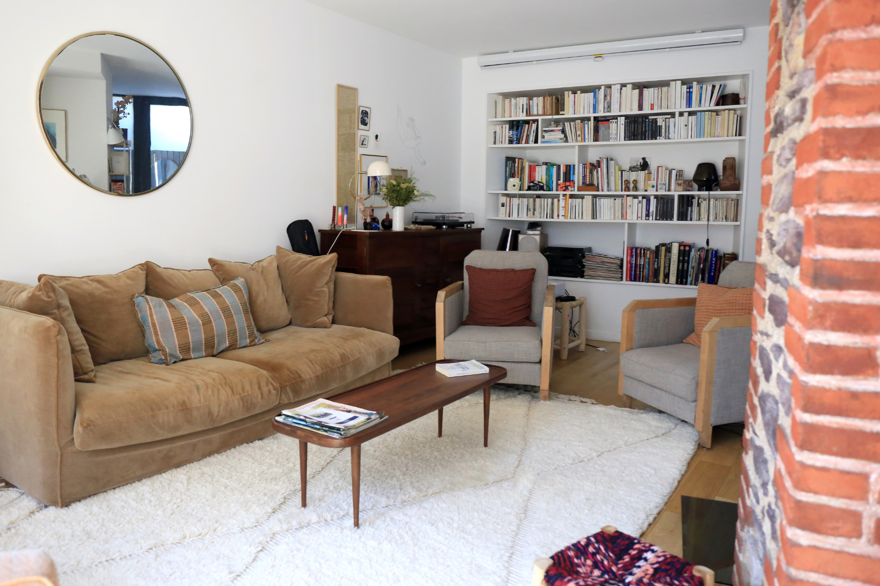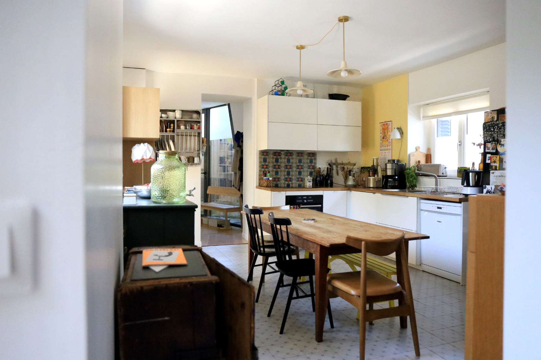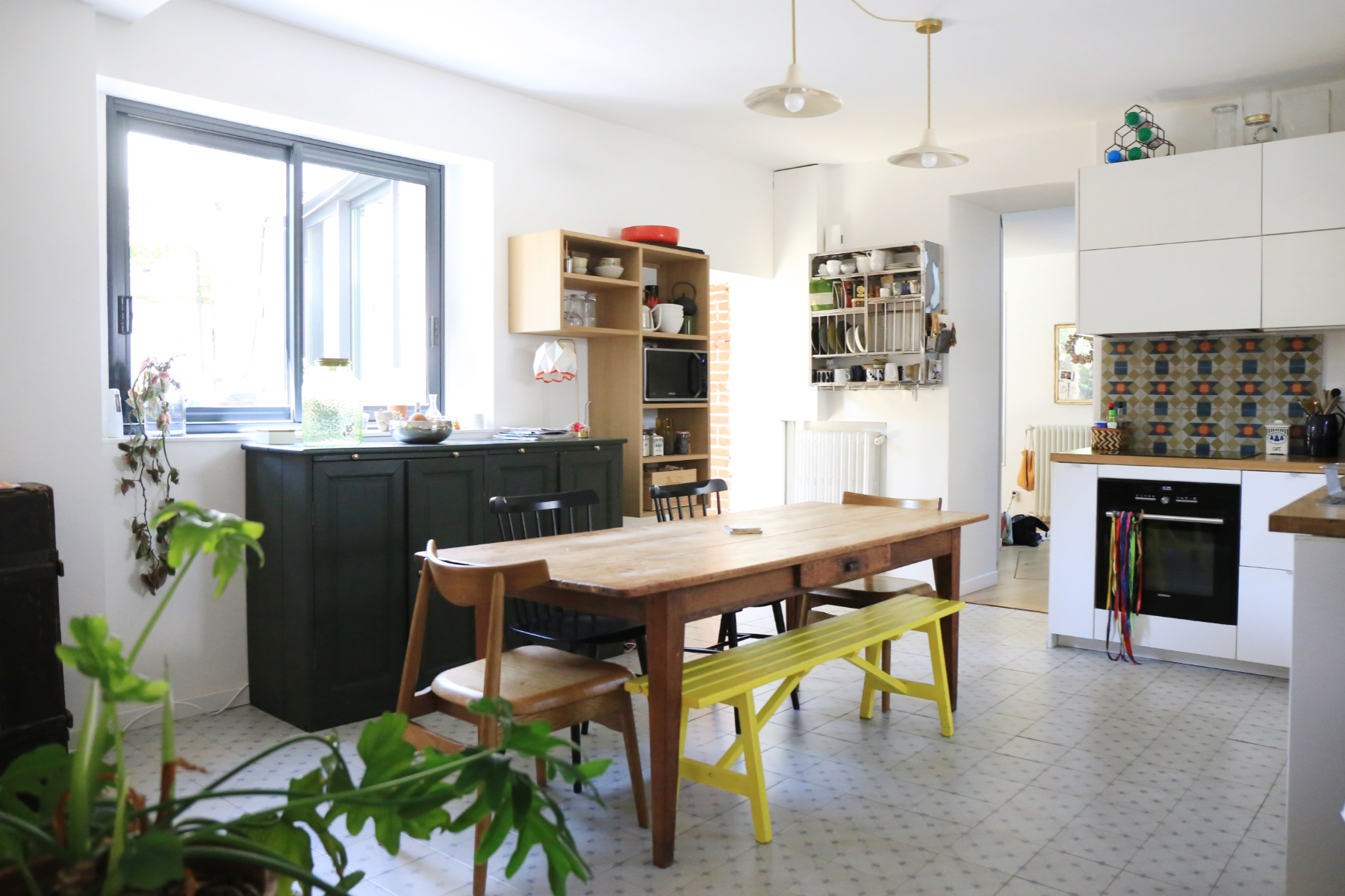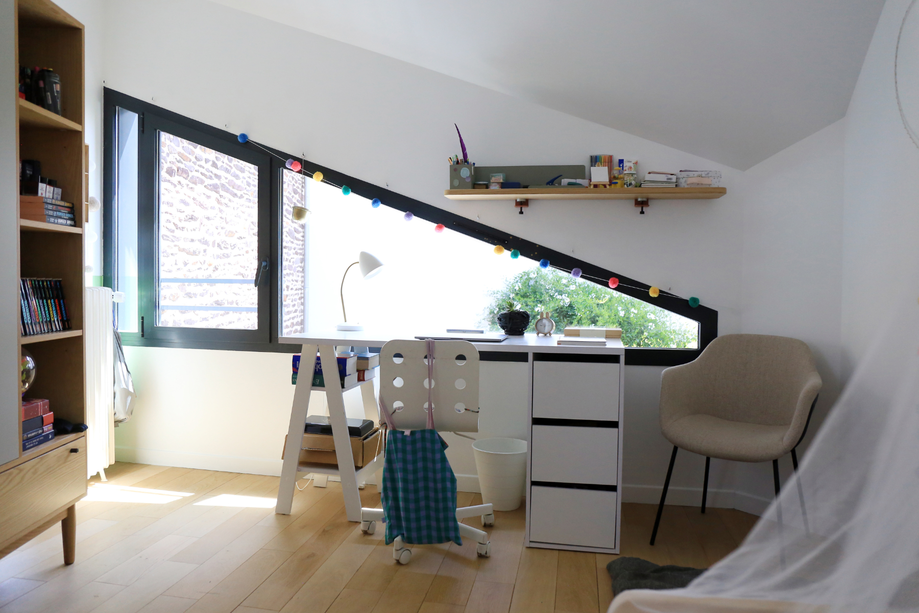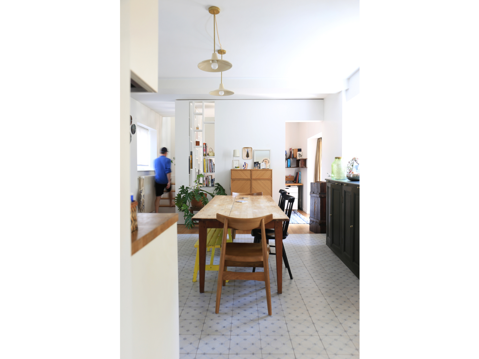 L'extension abrite au rez-de-chaussée une entrée et un salon. L'ouverture de l'ancienne porte d'entrée et une ancienne fenêtre transformée en passage dessinent une double circulation avec la maison existante et permet d'articuler les espaces entre eux de façon fluide, de laisser circuler la lumière et de conserver la lecture de l'ancienne maison en conservant la pierre de schiste et les briques apparentes. Le mur porteur au centre de la maison d'origine est supprimé et une ouverture est créée dans la cuisine pour gagner de l'espace et de la luminosité. Une cloison-claustra vient délimiter un espace bureau-vidéo sans pour autant l'isoler complètement. Un nouvel escalier confortable mène à l'étage qui abrite maintenant 3 grandes chambres et une grande salle d'eau. Un espace bureau est également aménagé dans les combles existants.