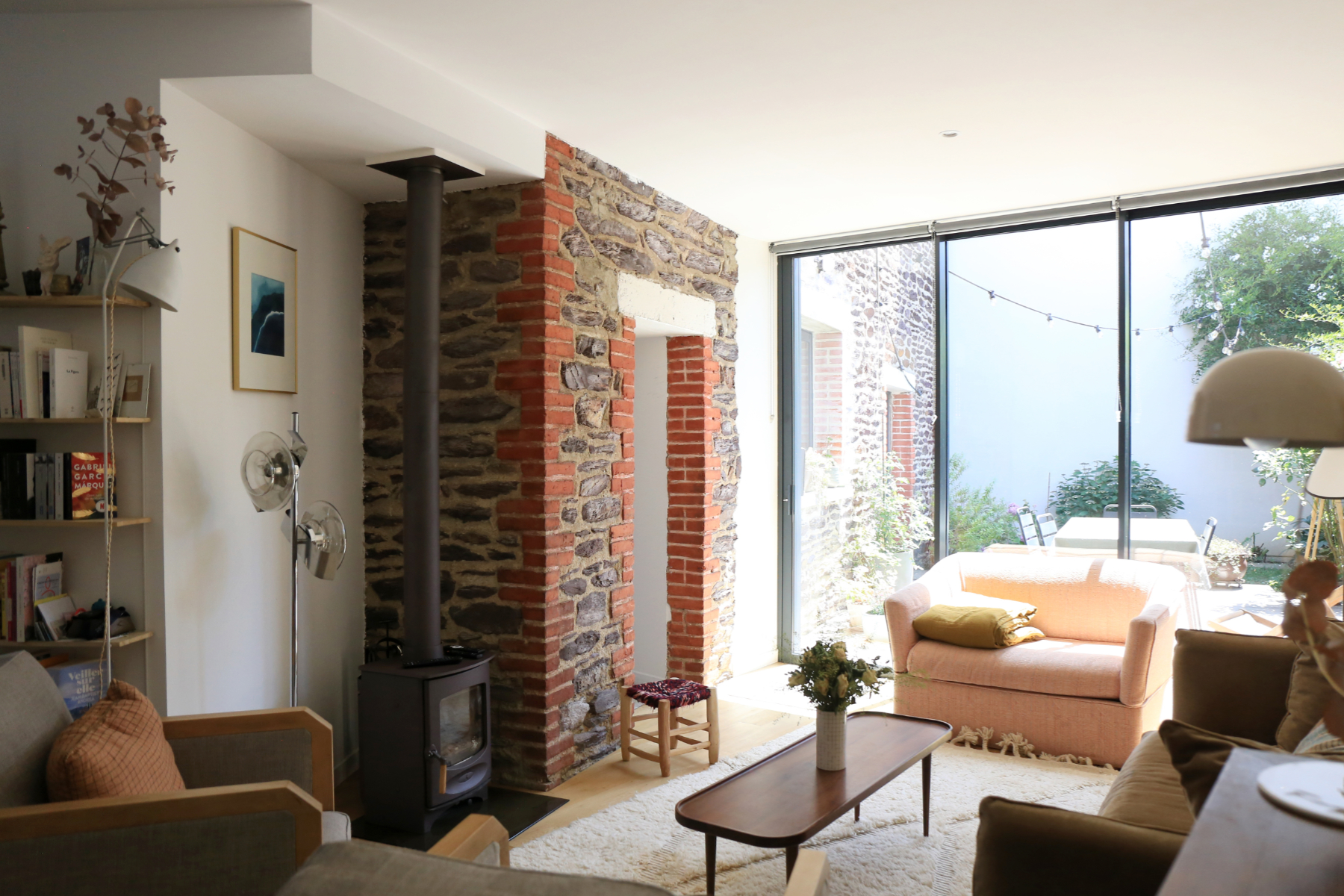 Les nouveaux propriétaires de cette petite maison en pierres et briques des années 1930 avaient besoin de rénover la maison, d'en pousser les murs, mais aussi de repenser toute son organisation. La maison d'une soixantaine de mètres carrés était "dans son jus", très peu ouverte côté jardin, coupée en deux au rez-de-chaussée par un mur porteur central et l'accès aux deux chambres et à la salle d'eau à l'étage se faisait par un escalier très étroit, raide et tarabiscoté. Le terrain, à l'angle de deux rues, ne faisant que 130m², la surface d'emprise au sol possible pour l'extension était contrainte à 30m². L'extension, construite en ossature bois, pour notamment limiter l'épaisseur des murs, permet de gagner 50m² habitables, répartis sur 2 niveaux.