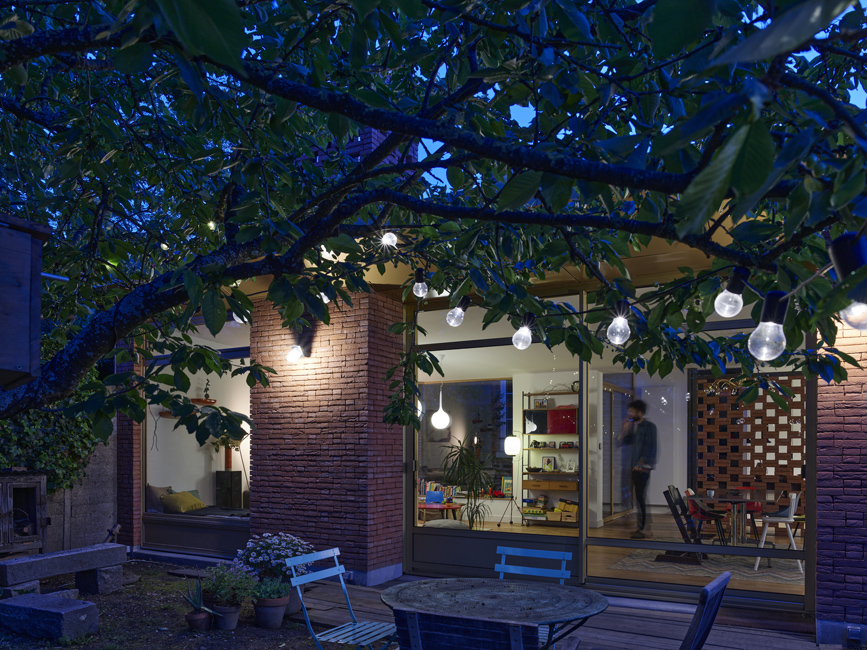 L'extension se pose au niveau du jardin. Elle intègre le nouvel espace d'entrée, le nouveau garage, un abri vélos/atelier de bricolage et une généreuse pièce de vie où la frontière entre le jardin et l'intérieur s'efface. Un patio relie visuellement les deux volumes et leurs deux époques de construction : la maison des années 30 et l’agrandissement dessiné dans un esprit années 1950, cher aux propriétaires.