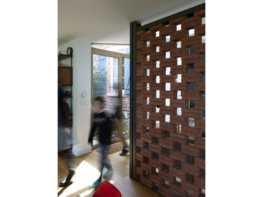La construction fait la part belle aux matériaux nobles : chêne (menuiseries, appuis de baies et parquet), aluminium (menuiseries et habillages), béton brut de décoffrage ou texturé pour l’accès et le coin feu dans le salon, carreaux de ciment, terrazzo et brique pleine moulée main appareillée en quinconce. Cette brique pour les façades du jardin et du patio est posée sur la dalle et agrafée à l’ossature bois. On la retrouve également sur la souche de cheminée ajourée et sur les murs claustras.