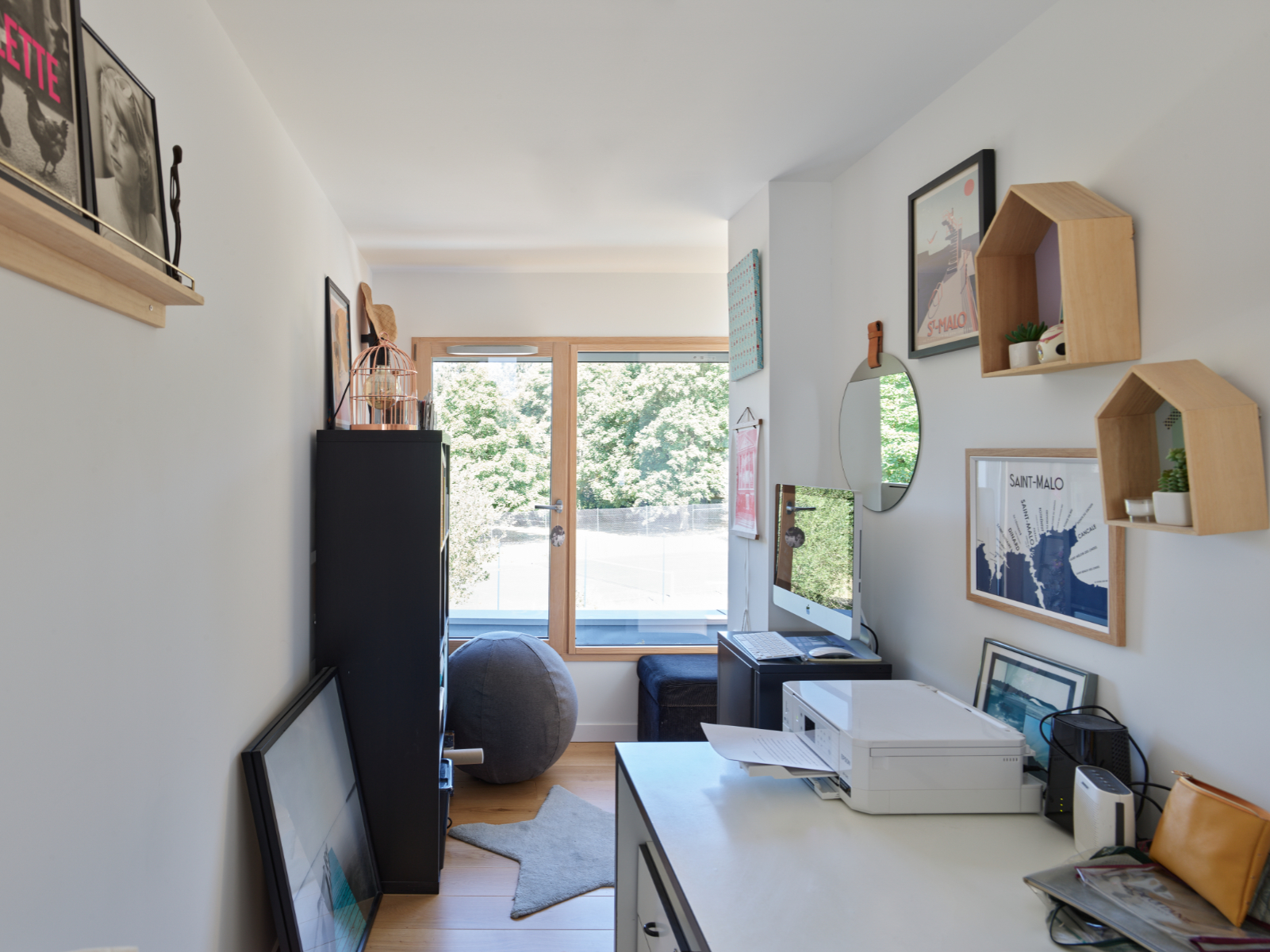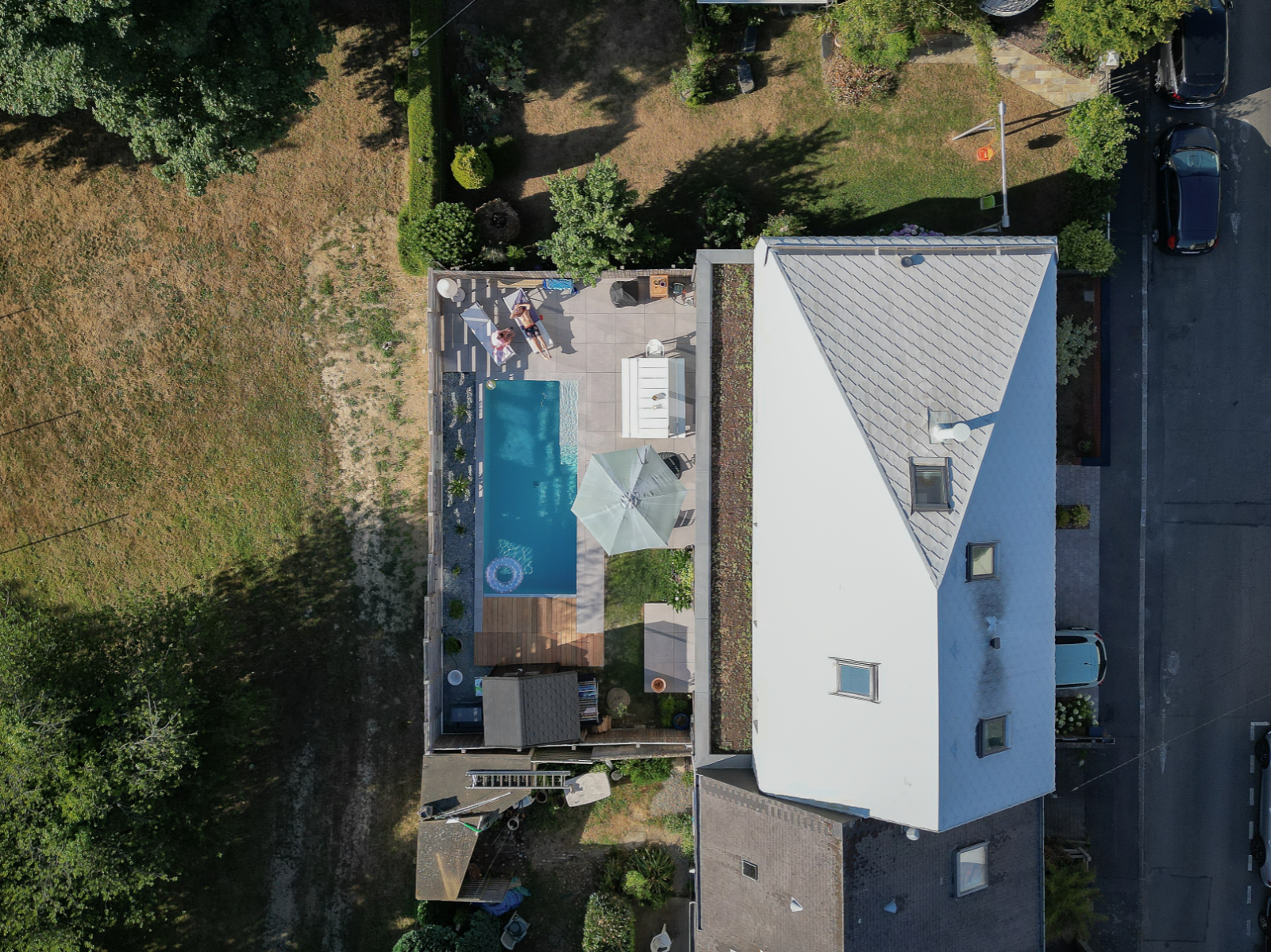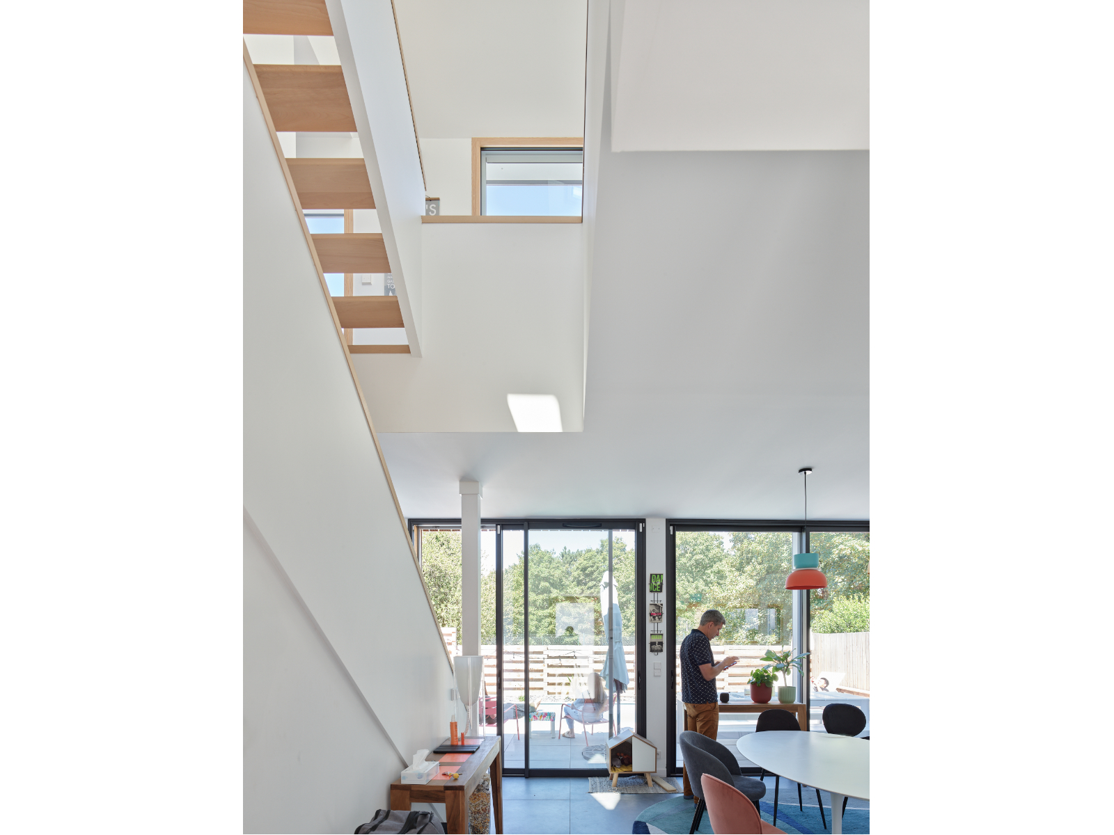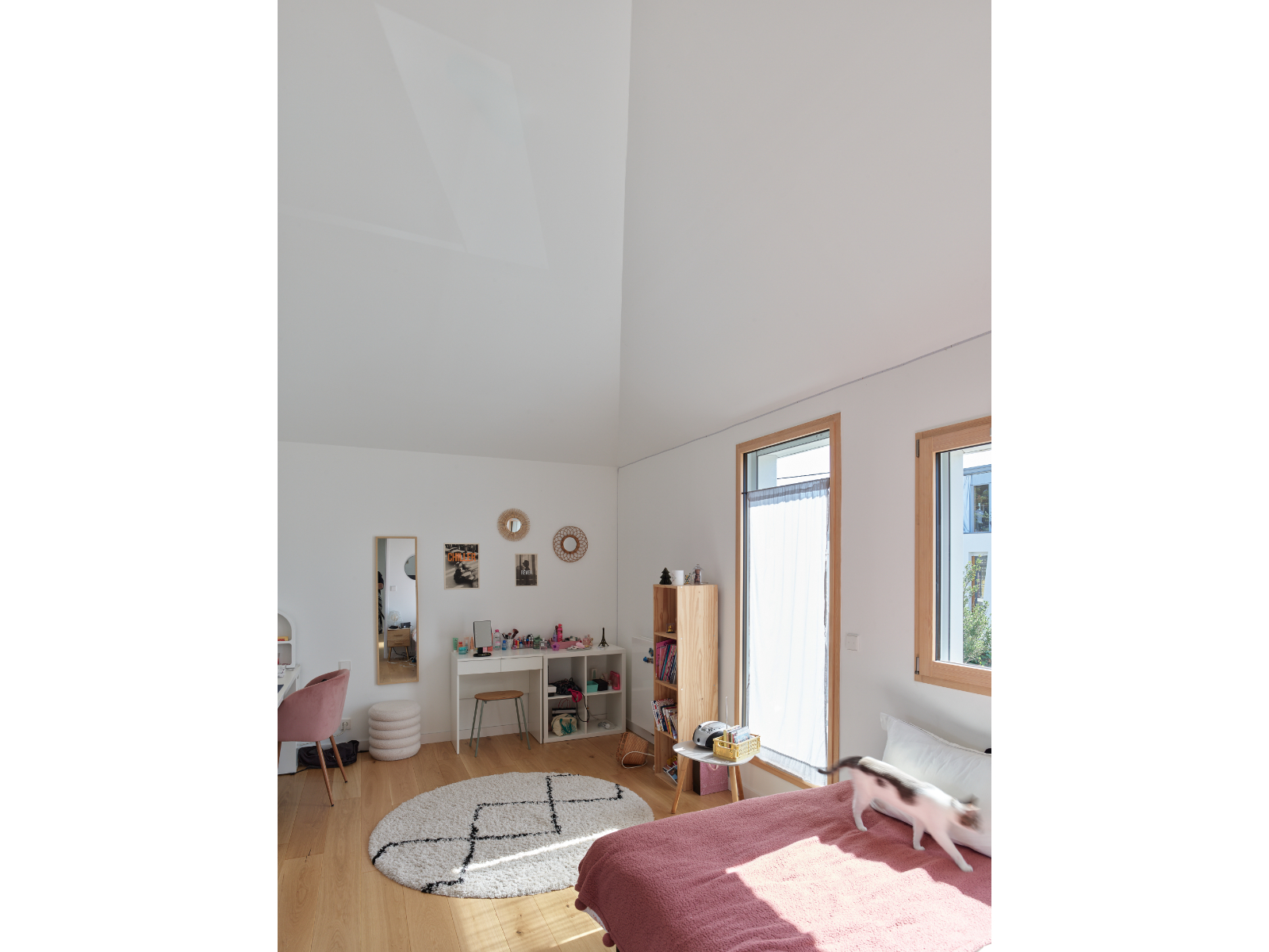 Il y avait sur ce terrain une petite maison ancienne et vétuste en fond de jardin, très étroite, mono-orientée et entièrement tournée vers la rue, donc avec beaucoup de vis à vis. Pour intimiser le jardin et profiter de la vue sur un espace boisé protégé sur le terrain voisin en fond de parcelle, l'ancienne maison est démolie. La maison neuve s'implante dans la continuité des maisons de la rue et sur toute la largeur de la parcelle. Très légèrement plus haute que les maisons voisines, elle offre des volumes intérieurs généreux avec de belles hauteurs sous plafond (2,80m au rez-de-chaussée et jusqu'à 4,30m dans les chambres des enfants), et des espaces traversants très lumineux qui s'ouvrent pleinement et sans aucun vis à vis sur la terrasse, le jardin, la piscine puis l'horizon arboré. La maison abrite une pièce de vie de 53m², 5 chambres, 3 salles d'eau, 1 bureau et 1 sauna. Une belle arrière cuisine, une grande cave et un petit grenier offrent enfin un espace de stockage généreux.