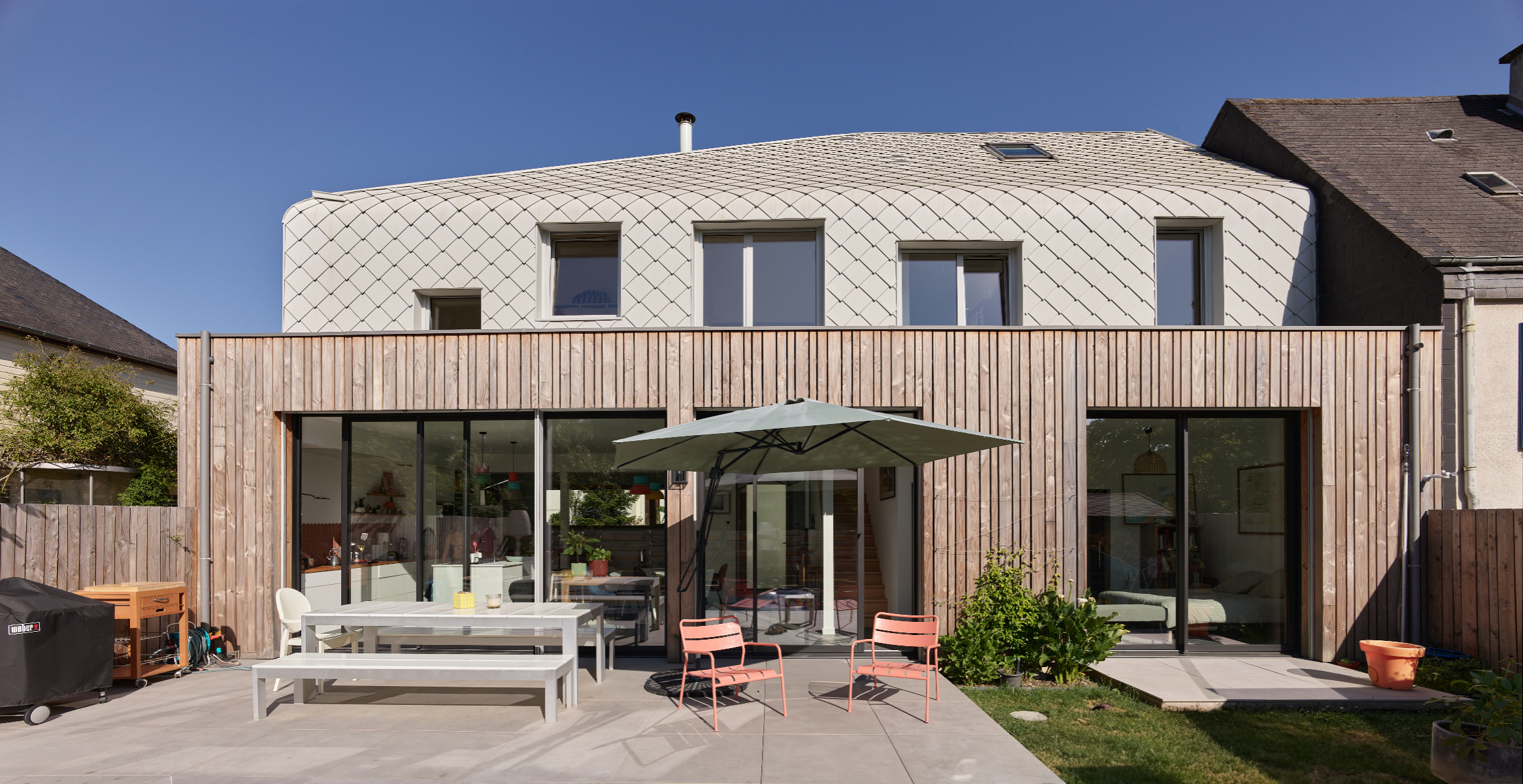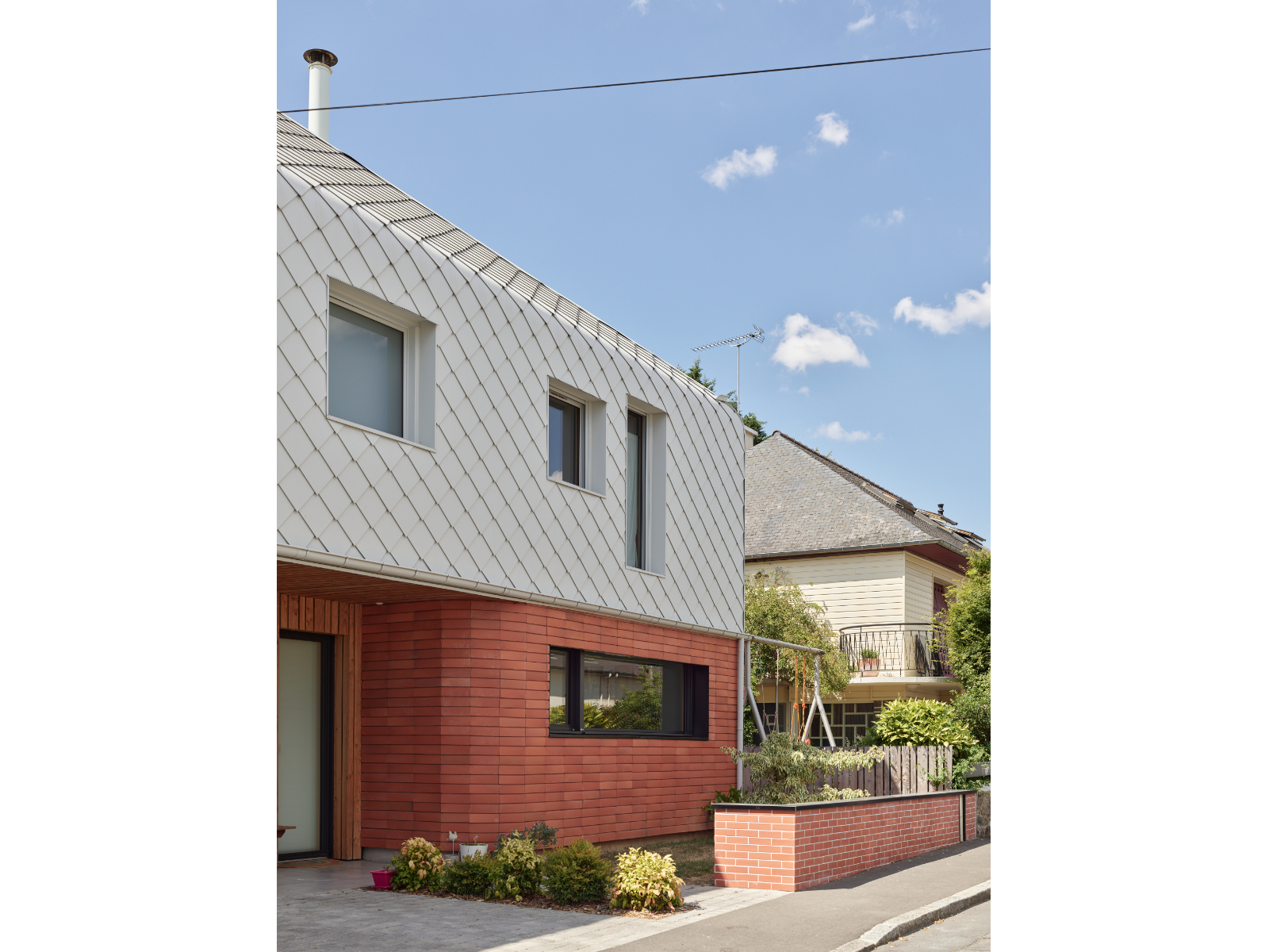 La maison reprend le principe de rez-de-chaussée "socle" remarquable sur plusieurs maisons de la rue, marqué par ses bardages en bois et en terre cuite, qui conduisent à l'entrée. La couverture est volontairement tronquée côté Nord, pour limiter l'ombre portée chez le voisin et ne pas construire un volume inutile. L'étage et la couverture sont comme une carapace d'écailles d'aluminium blanc, qui descend comme une peau et contraste avec les autres matières. L'effet carapace des écailles d'aluminium est accentué par la mise en place des gouttiètres en bas du bardage: la jonction toiture-façades est alors légèrement arrondie, pour guider l'eau jusqu'en pied de mur. La teinte claire, en toiture comme en façades, associée à des occultations extérieures commandées par domotique, permet que les chambres restent très confortables, même en cas de forte chaleur.