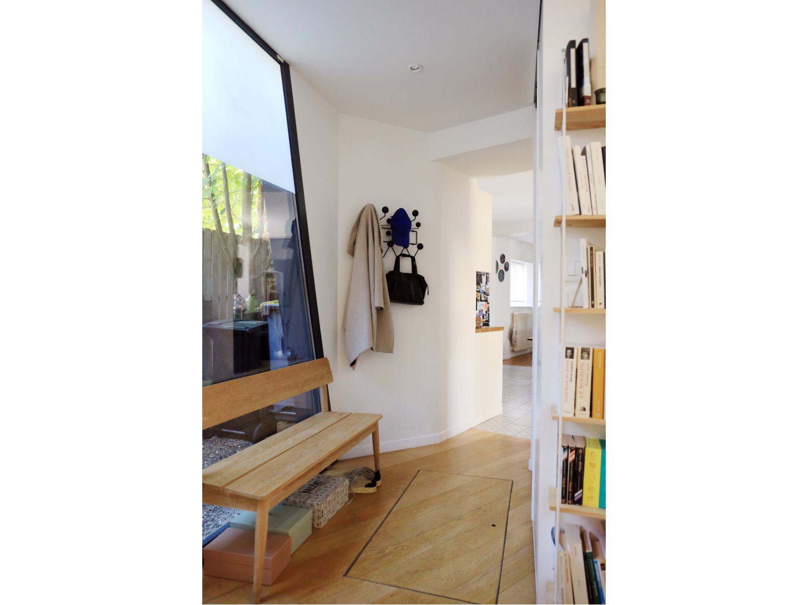 L'extension abrite au rez-de-chaussée une entrée et un salon. L'ouverture de l'ancienne porte d'entrée et une ancienne fenêtre transformée en passage dessinent une double circulation avec la maison existante et permet d'articuler les espaces entre eux de façon fluide, de laisser circuler la lumière et de conserver la lecture de l'ancienne maison en conservant la pierre de schiste et les briques apparentes. Le mur porteur au centre de la maison d'origine est supprimé et une ouverture est créée dans la cuisine pour gagner de l'espace et de la luminosité. Une cloison-claustra vient délimiter un espace bureau-vidéo sans pour autant l'isoler complètement. Un nouvel escalier confortable mène à l'étage qui abrite maintenant 3 grandes chambres et une grande salle d'eau. Un espace bureau est également aménagé dans les combles existants.