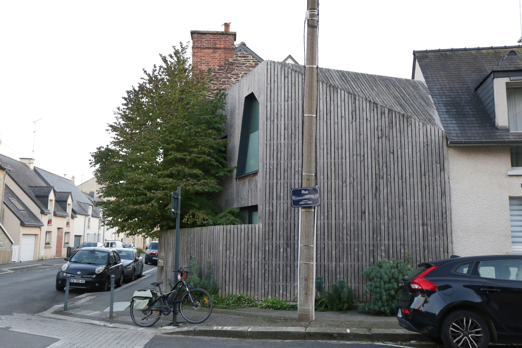 Les nouveaux propriétaires de cette petite maison en pierres et briques des années 1930 avaient besoin de rénover la maison, d'en pousser les murs, mais aussi de repenser toute son organisation. La maison d'une soixantaine de mètres carrés était "dans son jus", très peu ouverte côté jardin, coupée en deux au rez-de-chaussée par un mur porteur central et l'accès aux deux chambres et à la salle d'eau à l'étage se faisait par un escalier très étroit, raide et tarabiscoté. Le terrain, à l'angle de deux rues, ne faisant que 130m², la surface d'emprise au sol possible pour l'extension était contrainte à 30m². L'extension, construite en ossature bois, pour notamment limiter l'épaisseur des murs, permet de gagner 50m² habitables, répartis sur 2 niveaux.