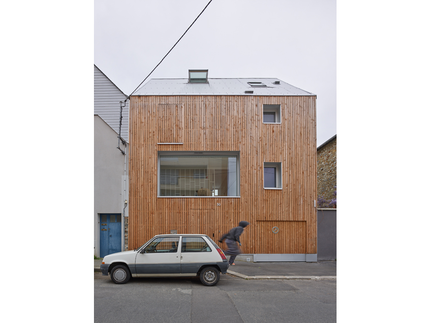 Cette maison neuve sur un petit terrain de ville s'organise autour d'un patio. Le rez-de-chaussée accueille les pièces de vie qui alternent différences de volumes et transparences depuis la rue vers le jardin. Les étages sont dédiés aux chambres qui elles aussi profitent de volumes généreux et baignés de lumière. On y accède par un escalier bibliothèque suspendu, élément fort de la maison, qui forme un filtre par rapport à la rue, mais structure également les volumes ouverts.